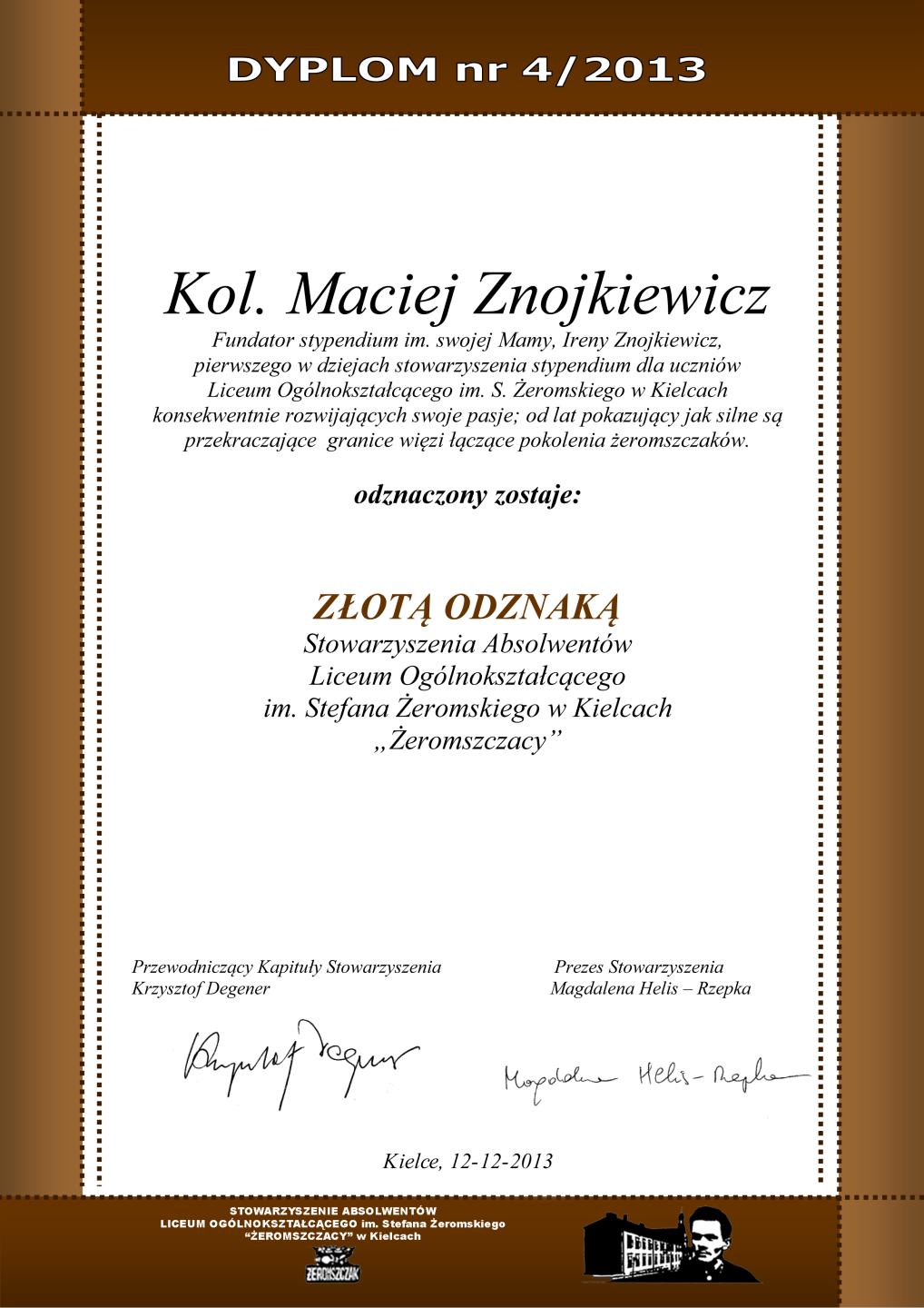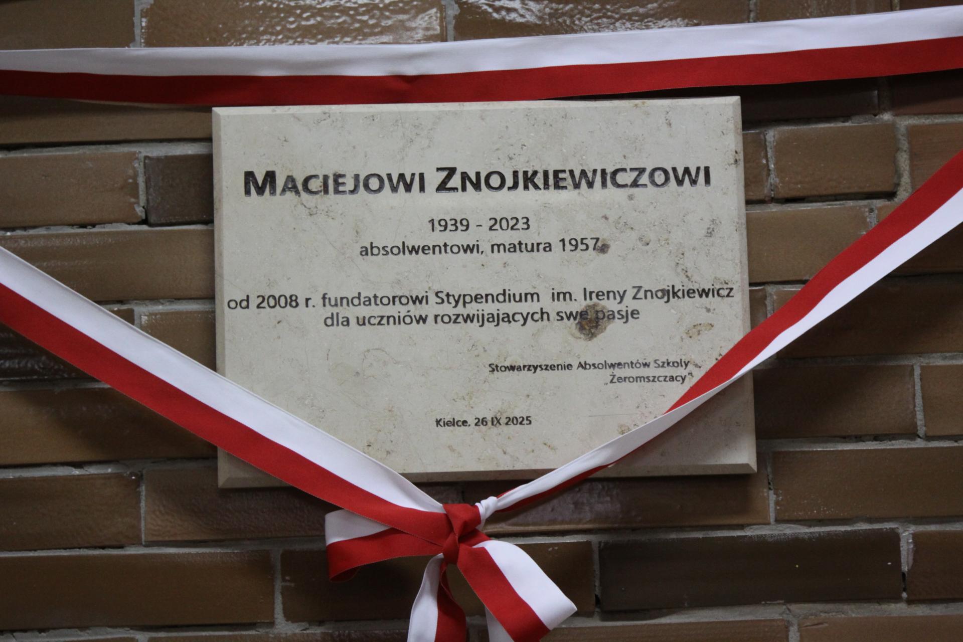 W czasie ostatniego zjazdu absolwentów, 26 września 2025 r., miała miejsce w szkole skromna, ale doniosła uroczystość. Przed wejściem do auli została odsłonięta tablica upamiętniająca  zmarłego w grudniu 2023 roku absolwenta, Macieja Znojkiewicza, pierwszego i jedynego w historii Szkoły i Stowarzyszenia fundatora stypendium przeznaczonego dla uczniów konsekwentnie rozwijających swoje zainteresowania i pasje, wypłacanego systematycznie przez lat 15. Wręczyliśmy ogółem 52 stypendia, w tym  48 indywidualnych i 4 zespołowe.