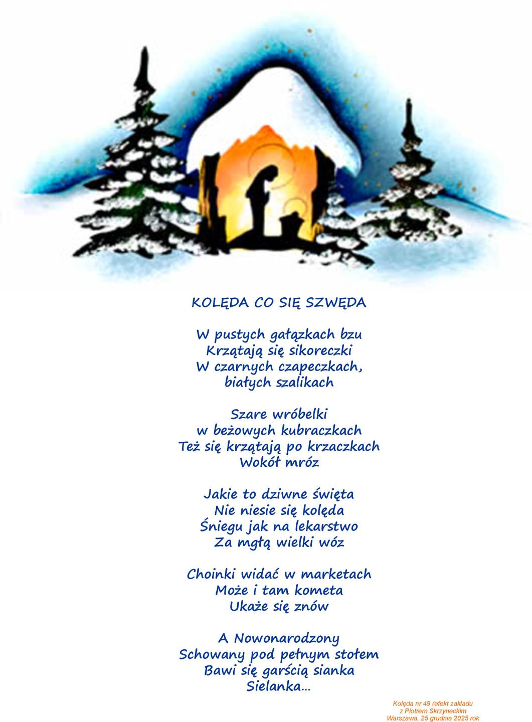 Przed nami święto Trzech Króli, to dobry moment na przywołanie kolędy będącej efektem zakładu kolegi Jarka Janowskiego z Piotrem Skrzneckim, szefem "Piwnicy pod Baranami". W grudniu 2024 roku powstała 49.