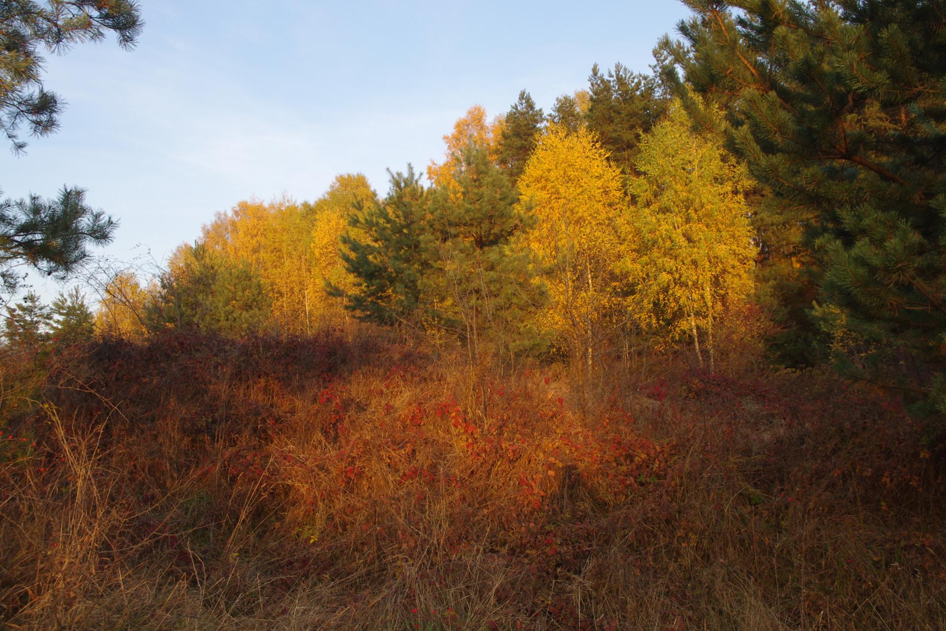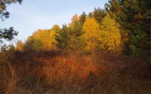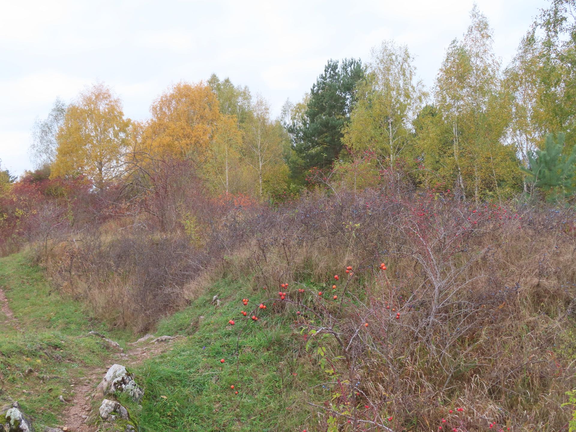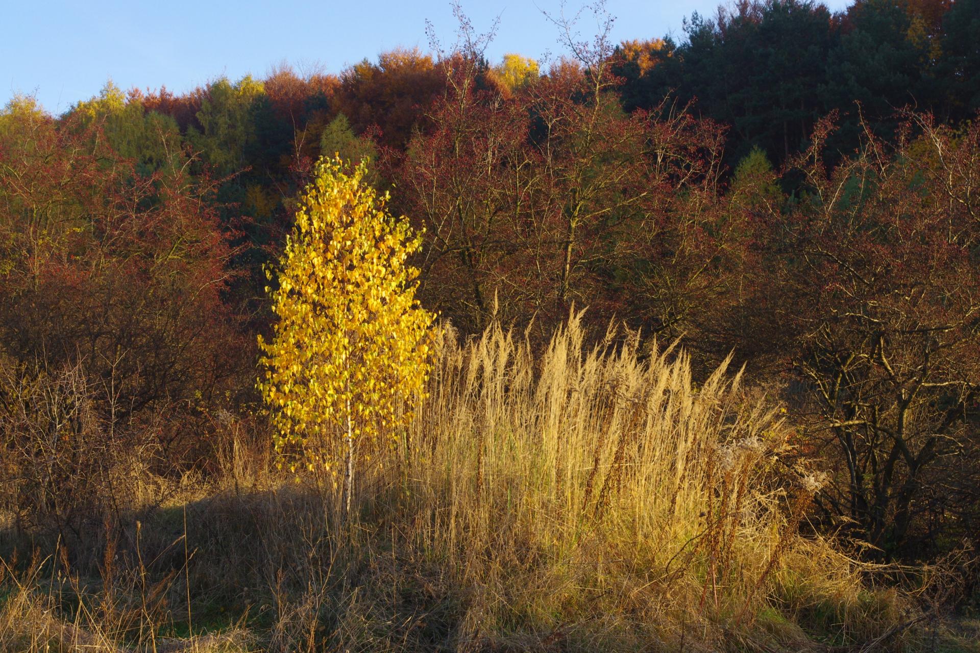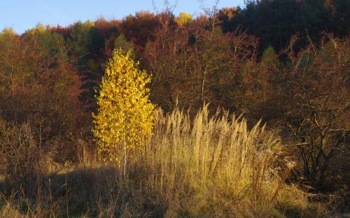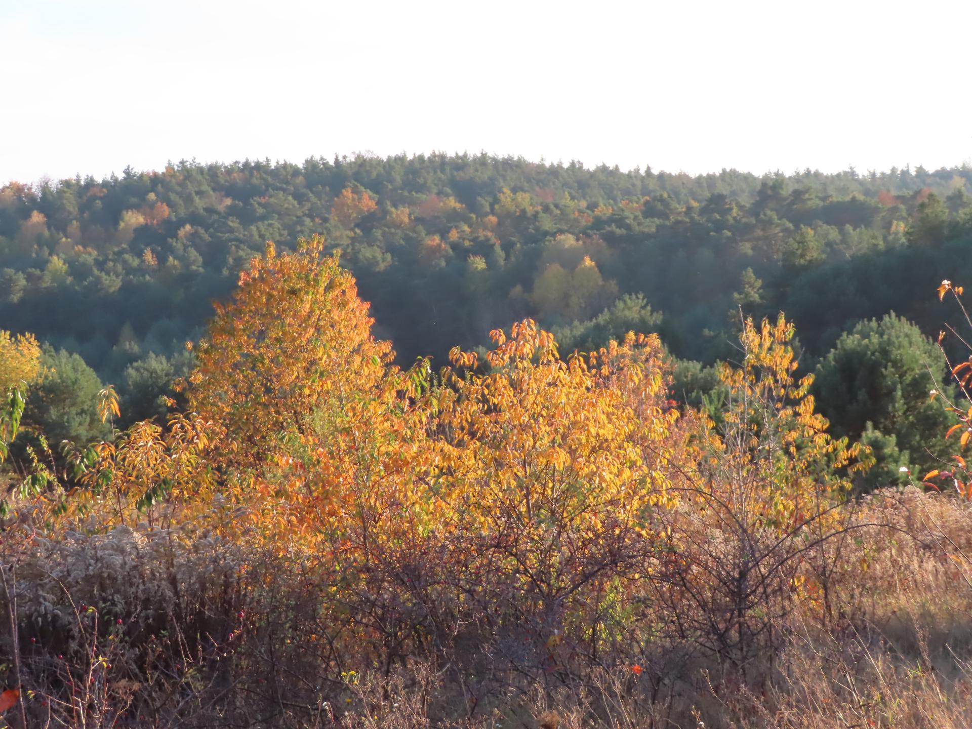 Z Karczówki możemy zejść na zachód po dywanach z żółtych i brązowych liści, które spadły z grabów, klonów i buków. A za nią Dalnia z czerwienią jesiennych dębów. Dalej Grabina z kolorowym widokiem poprzez kamieniołom, dolinę Sufragańca i Bobrzy, aż za Piekoszów i Pasmo Zgórskie, aż po horyzont. Pomiędzy wzgórzami brzozy świecą złotem liści i bielą pni. Jeszcze kwitną polne goździki, czerwienią się dzikie jabłka, głogi i róże, tarnina połyskuje niemal czarnym granatem, a nawłoć przybrała kolor biały.