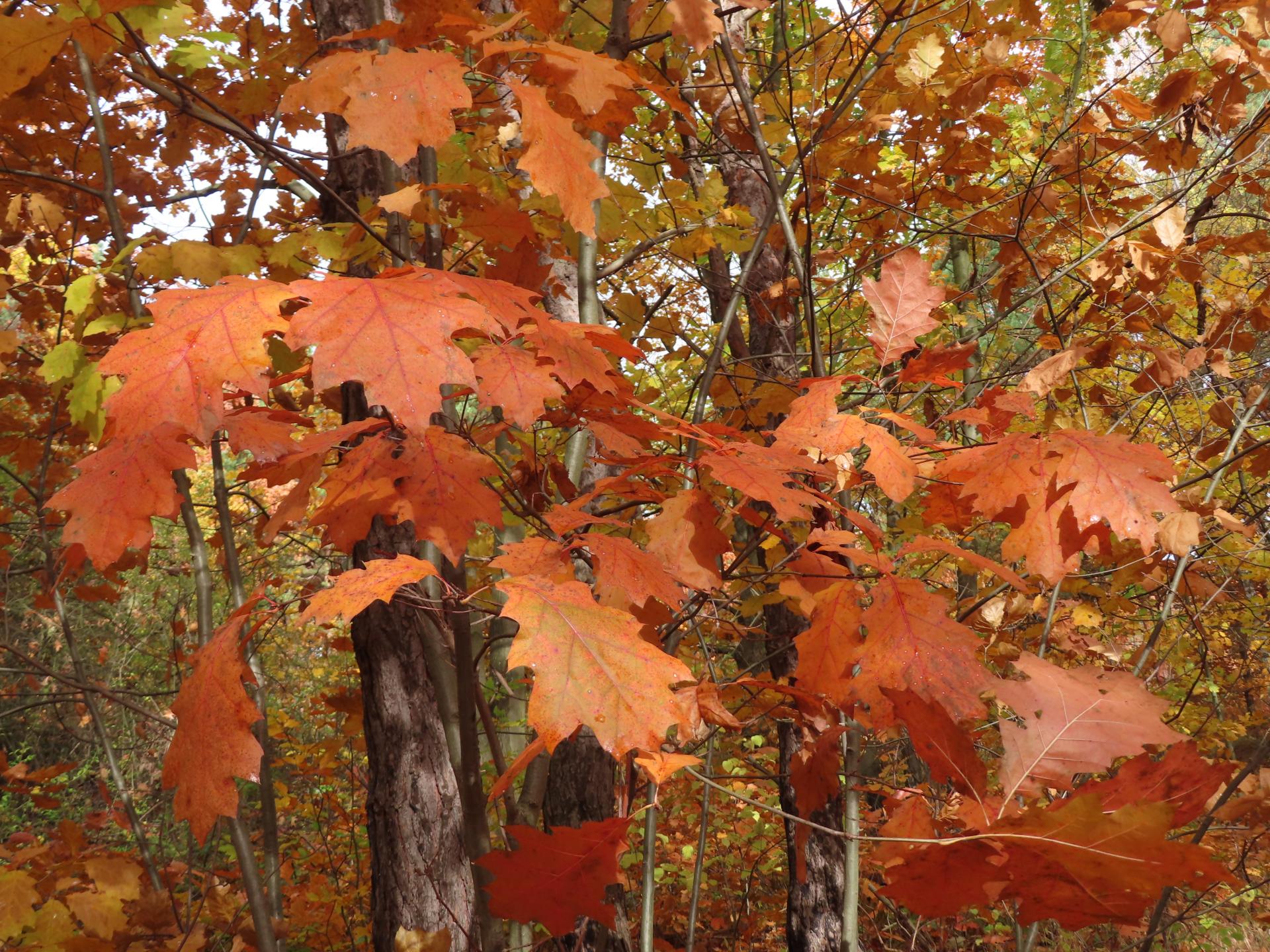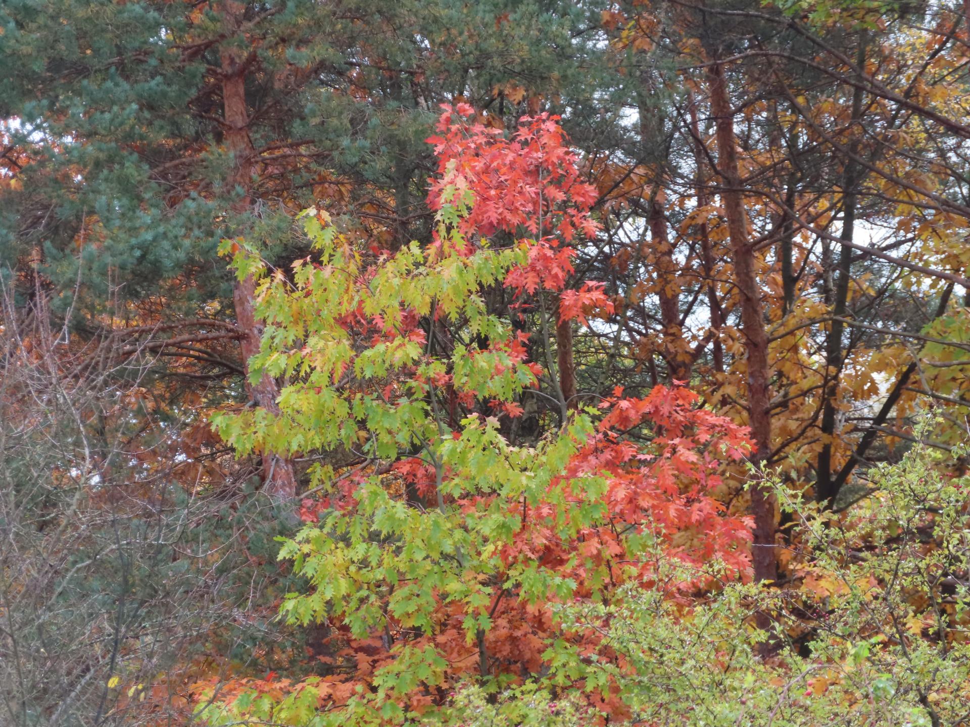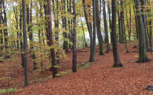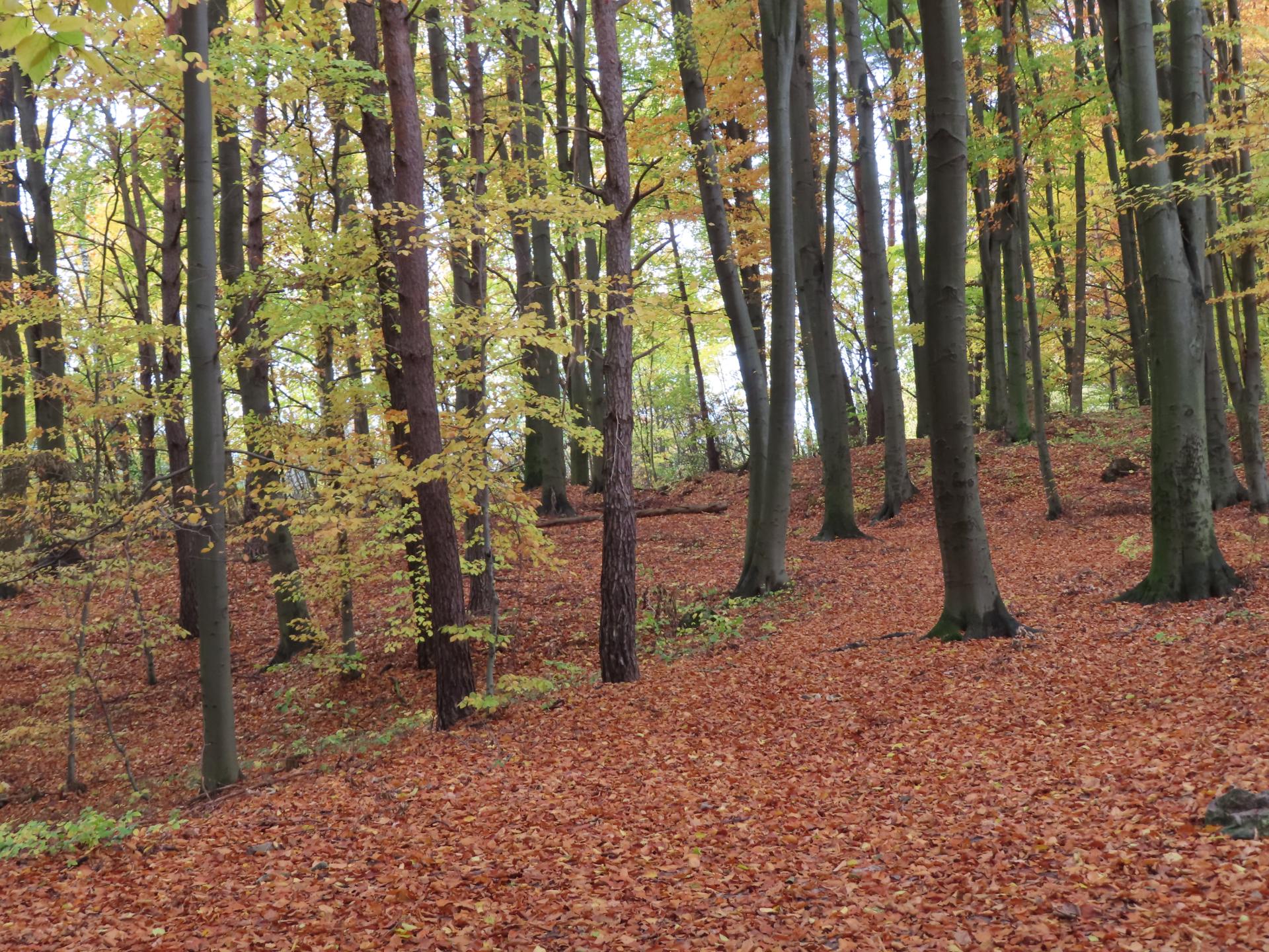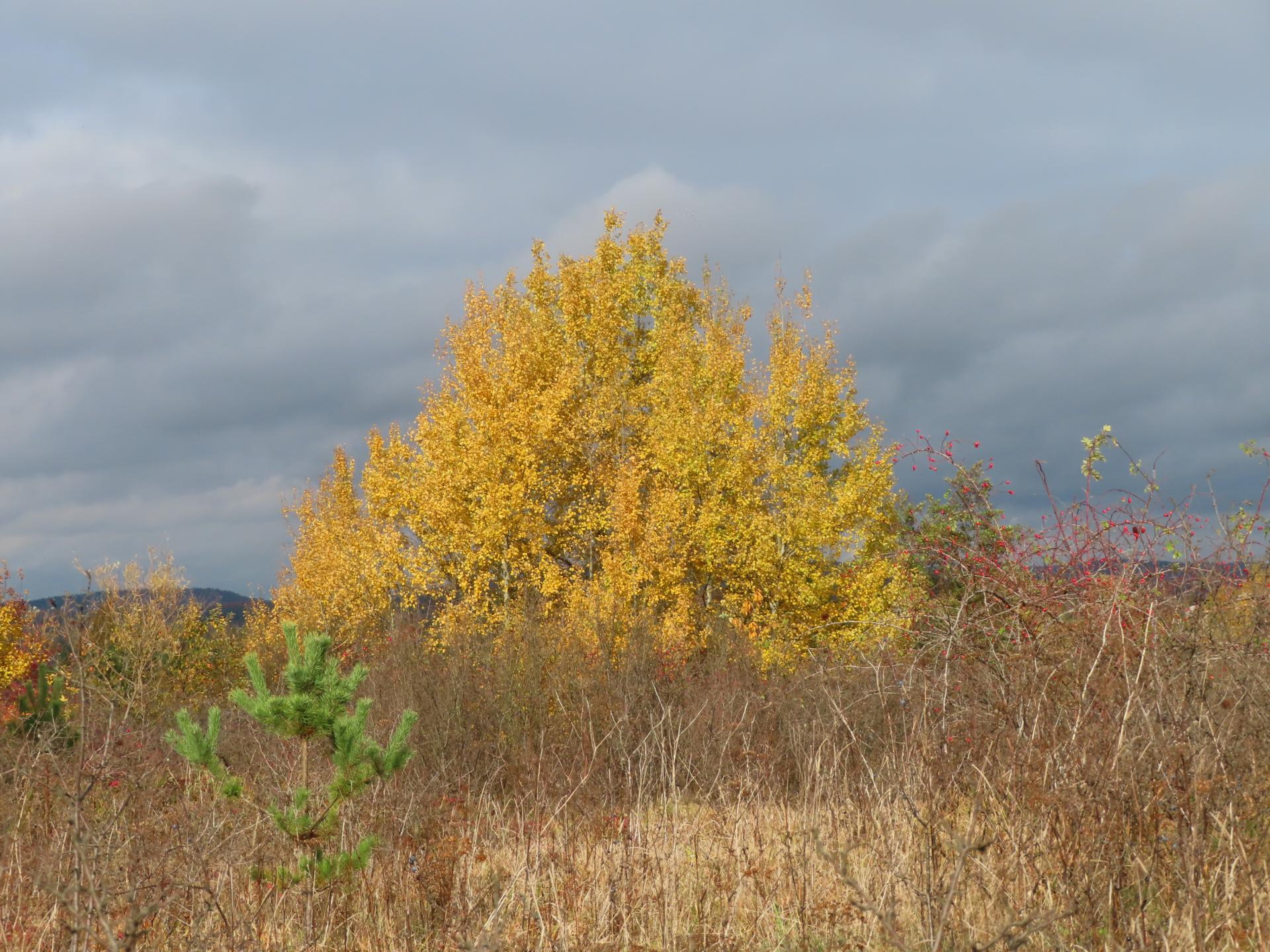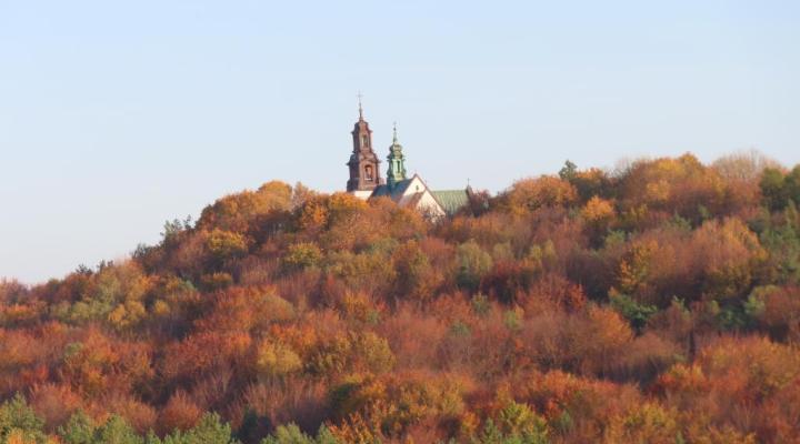Z Karczówki możemy zejść na zachód po dywanach z żółtych i brązowych liści, które spadły z grabów, klonów i buków. A za nią Dalnia z czerwienią jesiennych dębów. Dalej Grabina z kolorowym widokiem poprzez kamieniołom, dolinę Sufragańca i Bobrzy, aż za Piekoszów i Pasmo Zgórskie, aż po horyzont. Pomiędzy wzgórzami brzozy świecą złotem liści i bielą pni. Jeszcze kwitną polne goździki, czerwienią się dzikie jabłka, głogi i róże, tarnina połyskuje niemal czarnym granatem, a nawłoć przybrała kolor biały.