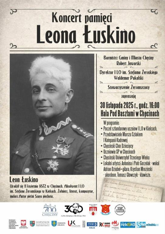 Serdecznie zapraszamy wraz z Burmistrzem Gminy i Miasta Chęciny Robertem Jaworskim na KONCERT PAMIĘCI LEONA ŁUSKINO autora pieśni "Szara Piechota".