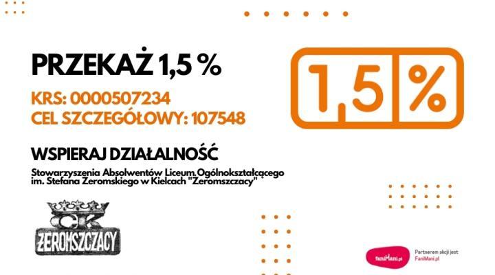 Jeśli zdecydujecie się na przekazanie 1,5% dla Stowarzyszenia Absolwentów I Liceum Ogólnokształcącego im. S. Żeromskiego „Żeromszczacy”, to środki z odpisu trafiają do nas jako wsparcie programów pomocowych dla uczniów naszej szkoły oraz zasilą finansowanie organizowanych przez nas wydarzeń społecznych, kulturalnych i historycznych.