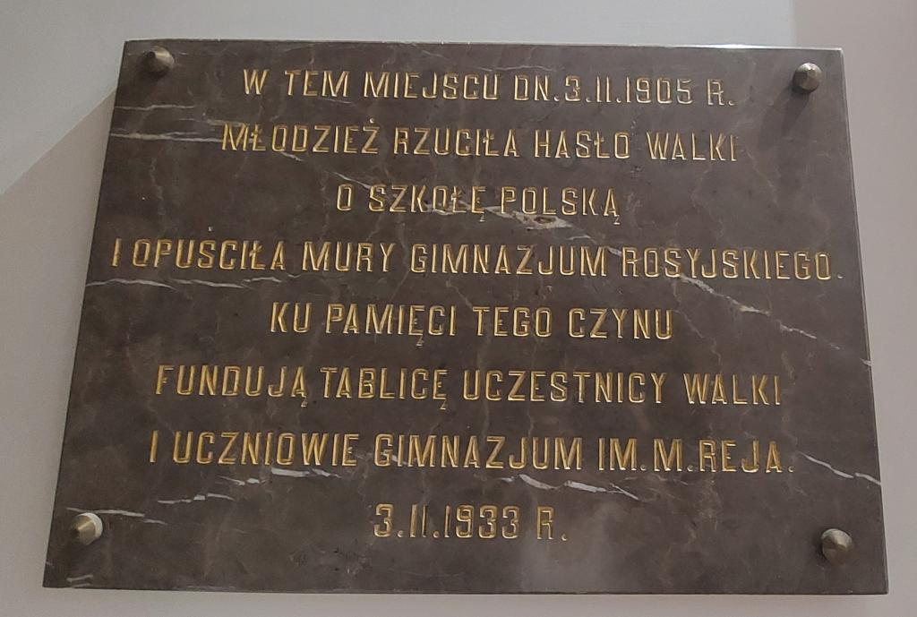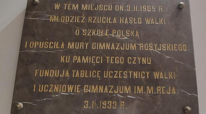 3 lutego 1905 roku uczniowie naszej szkoły i uczennice gimnazjum żeńskiego rozpoczęli walkę o polską szkołę. 3 lutego 1933 roku upamiętnili ten fakt zjazdem i tablicą w budynku szkoły. Przebieg strajkowych wydarzeń został dokładnie przedstawiony na stronie Ośrodka Myśli Patriotycznej i Obywatelskiej: https://ompio.pl/2021/02/strajk-szkolny-w-kielcach/