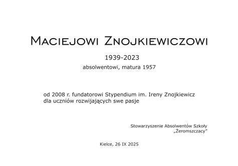 W czasie ostatniego zjazdu absolwentów, 26 września 2025 r., miała miejsce w szkole skromna, ale doniosła uroczystość. Przed wejściem do auli została odsłonięta tablica upamiętniająca zmarłego w grudniu 2023 roku absolwenta, Macieja Znojkiewicza, pierwszego i jedynego w historii Szkoły i Stowarzyszenia fundatora stypendium przeznaczonego dla uczniów konsekwentnie rozwijających swoje zainteresowania i pasje, wypłacanego systematycznie przez lat 15. Wręczyliśmy ogółem 52 stypendia, w tym 48 indywidualnych i 4 zespołowe.