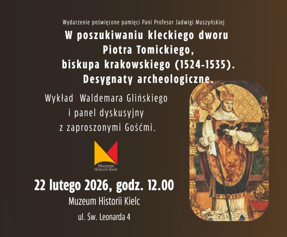 22 lutego o godzinie 12.00 Muzeum Historii Kielc zaprasza na wykład Waldemara Glińskiego, poświęcony zagadnieniu lokalizacji i identyfikacji tzw. kleckiego dworu Piotra Tomickiego w świetle dostępnych desygnatów archeologicznych.
